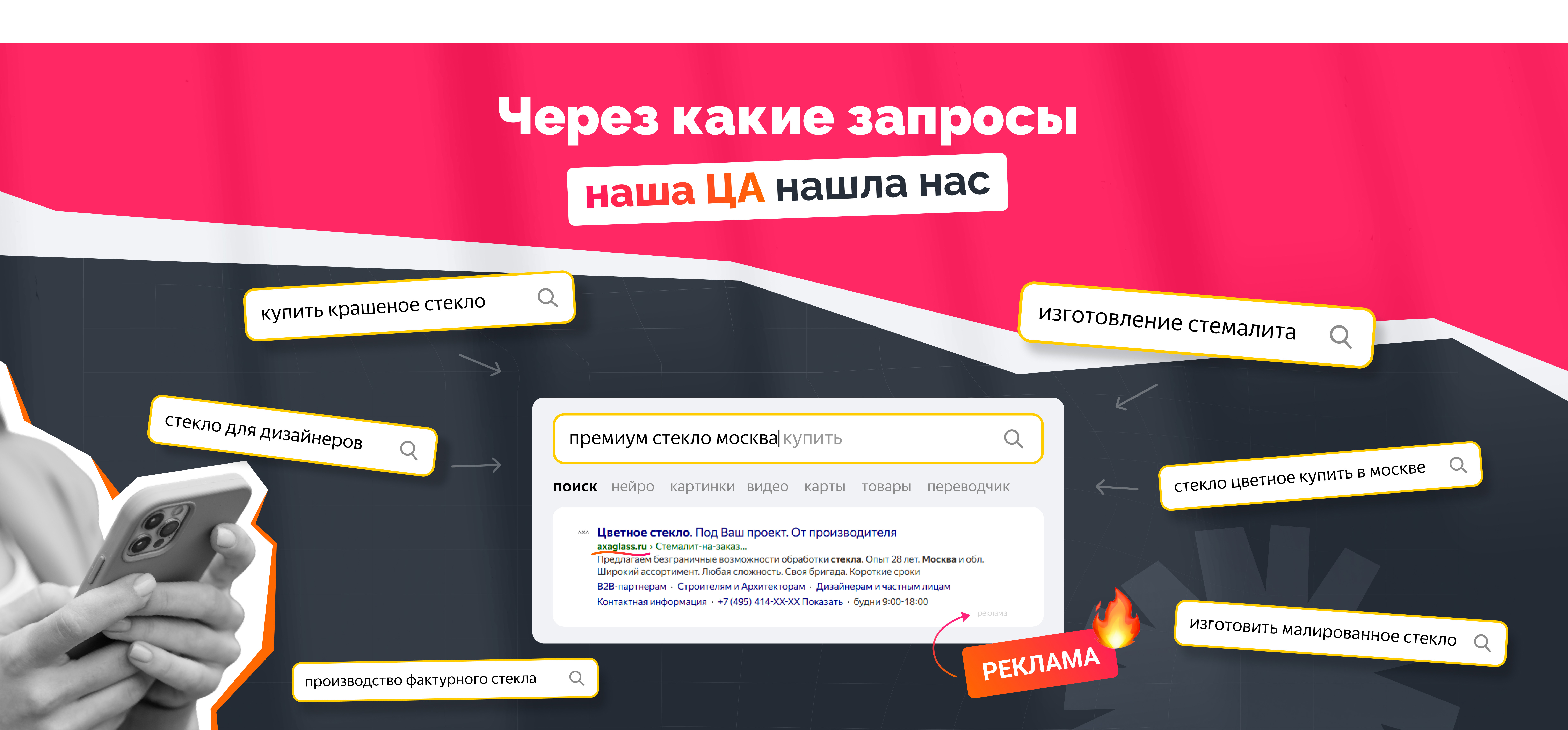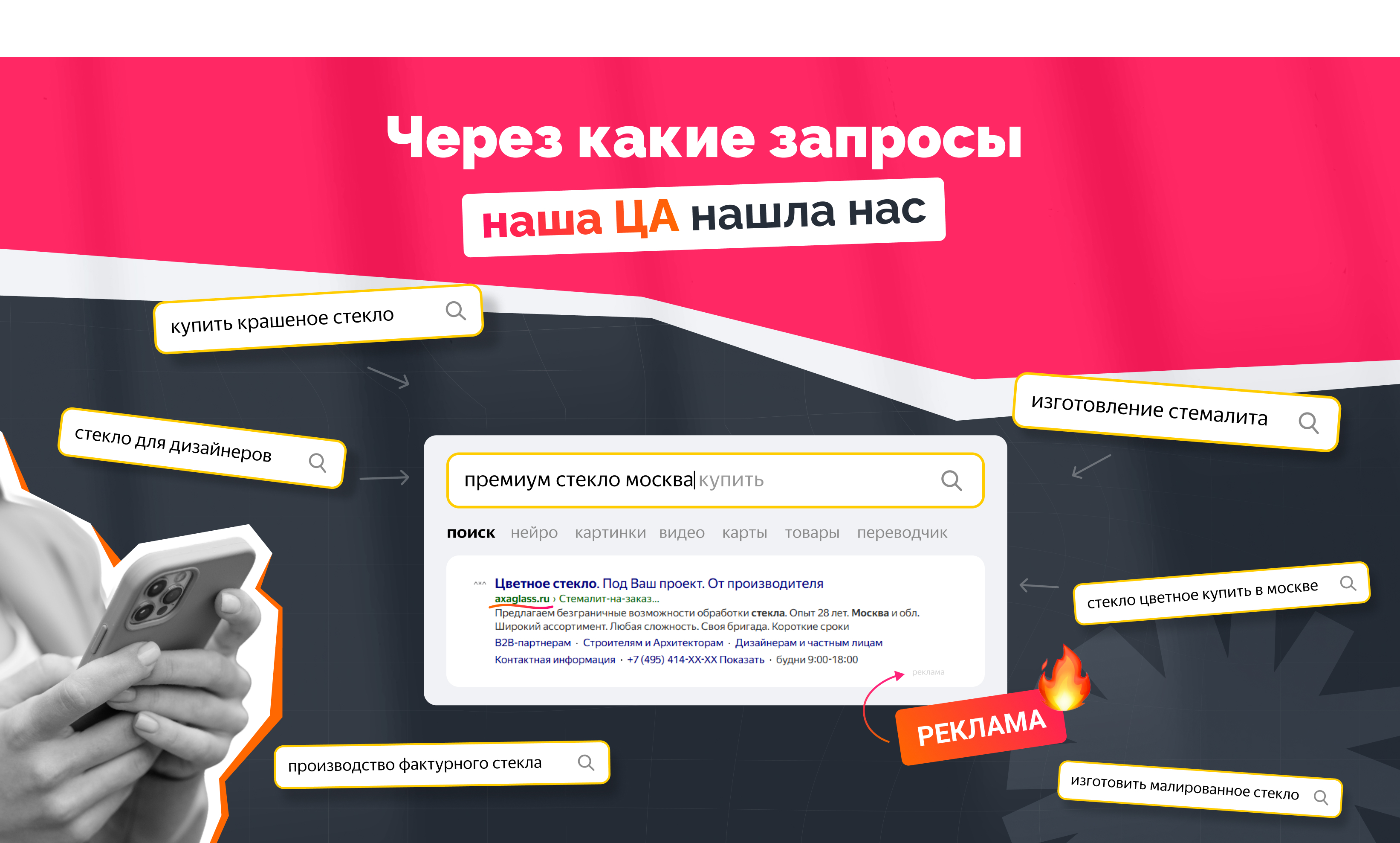 Компания «AXAGLASS» выполняет полный цикл работ по изготовлению, доставке и монтажу интерьерного стекла на заказ. Осуществляют свою деятельность в Москве и Московской области. До сотрудничества с нами заказчик не имел опыта работы с контекстной рекламой.