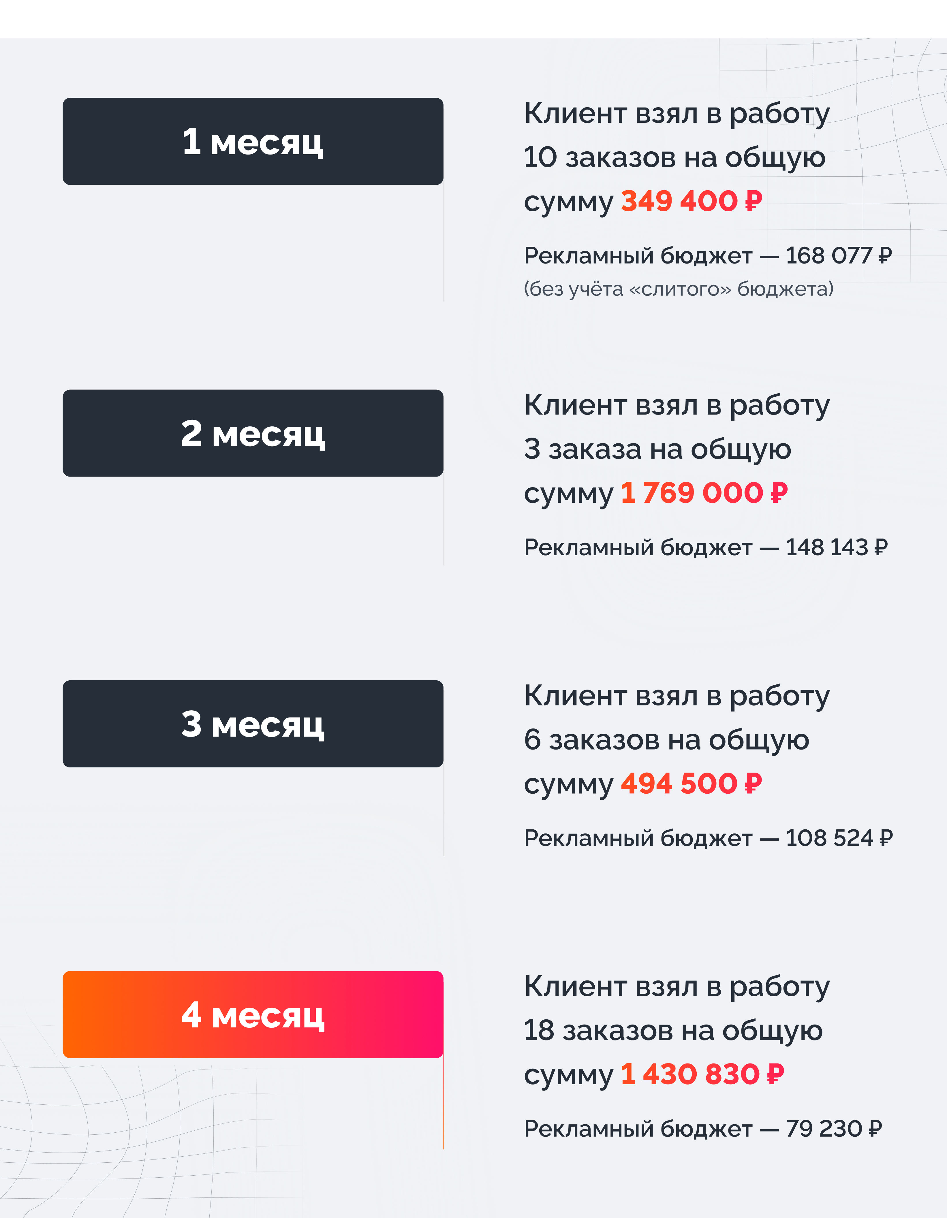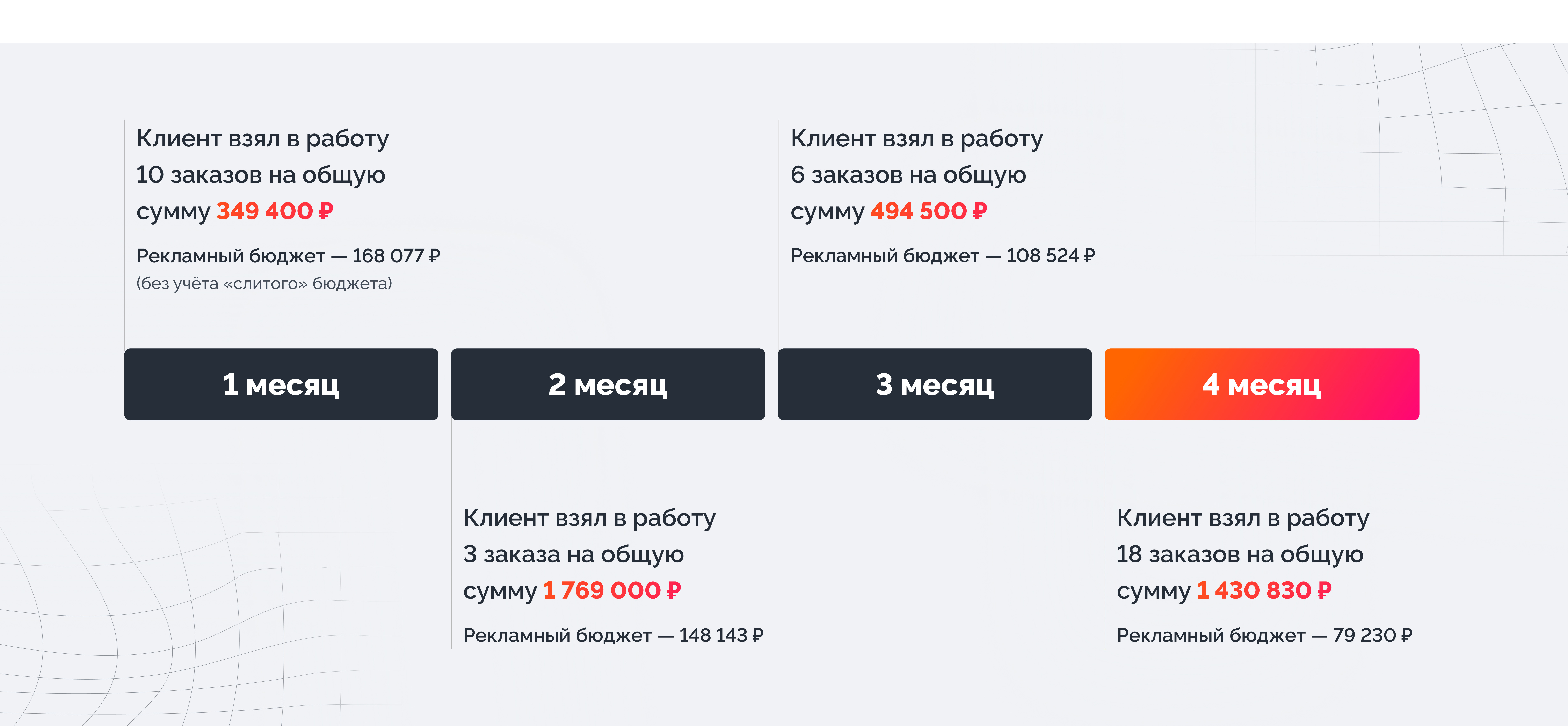За 4 месяца работы удалось снизить рекламный бюджет с 168 000 до 79 000 рублей и увеличить продажи клиента с рекламы в 4 раза.